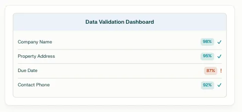 Extracted data is validated, checked for duplicates, and mapped to your system fields. Low-confidence fields are flagged for review.