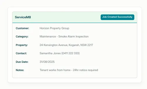 - Creates ServiceM8 job instantly