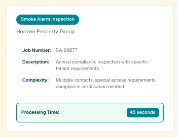 "Property manager emails work order SA-99877 for smoke alarm inspection to your Auto Work Order address"